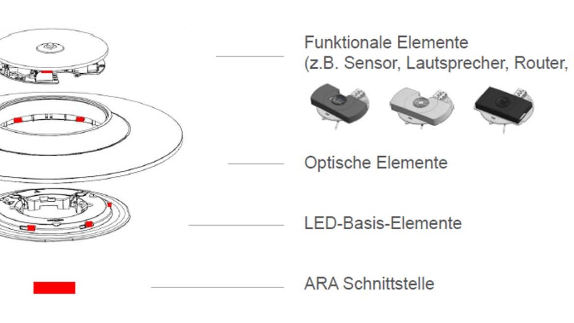 Das Tech-Start-up ARA des Strascheg Center for Entrepreneurship hat vor dem Hintergrund des Circular Economy Ansatzes und u.a. basierend auf den Forderungen des EU-Green-Deal ein herstellerübergreifendes und modular Baukastensystem für TGA entwickelt. Das Baukastensystem ermöglicht das Upgrade oder die Reparatur von Produkten durch den Austausch von Elementen. Hierunter fallen optische Elemente, LED Elemente sowie Funktionselemente wie Sensoren, Notlichter, Rauchmelder etc.