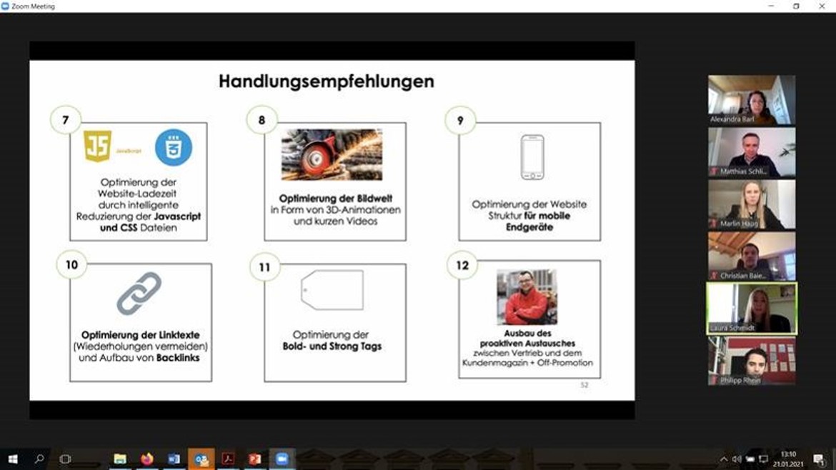 Zwei Studierendenteams fokussierten sich auf das Benchmarking und die Analyse des Contents, der Kanäle, der Seitenqualität und der Auffindbarkeit des Hilti Kunden-Magazins aus Kundensicht sowie dessen Vorteile für die Hilti Mitarbeitenden im Vertrieb. Alexandra Barl, die aktuell das Kundenmagazin verantwortet: „Die Studenten haben sich wirklich auf beeindruckende Art und Weise auf das Thema eingelassen. Die konkreten und professionell aufbereiteten Handlungsempfehlungen, die beide Gruppen aufgrund ihrer gründlichen Recherche und ihrer großen Initiative für uns entwickelt haben, sind sehr schlüssig und haben uns eine Menge Futter für die Optimierung unserer Strategie gegeben. Dass die Studenten dabei sogar selbstständig Kundengespräche auf die Beine gestellt haben, begeistert mich besonders.“