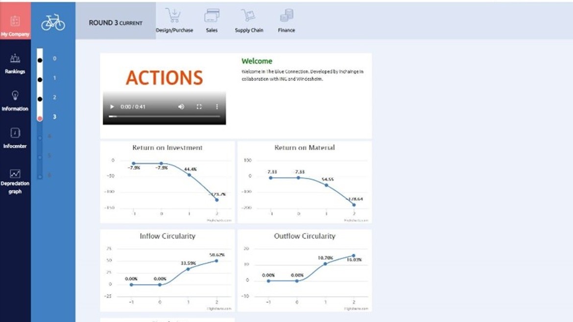 The Blue Connection ist ein webbasiertes Unternehmenssimulationsspiel, bei dem Teams aus vier Personen in die Rolle des Managements einer virtuellen E-Bike-Herstellungsfirma schlüpfen. Ihr Ziel ist es, einen Übergang zur Kreislaufwirtschaft zu meistern, während sie gleichzeitig die Profitabilität sichern.