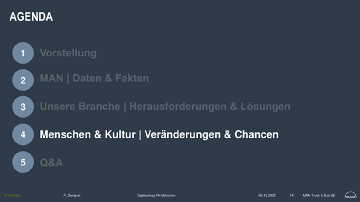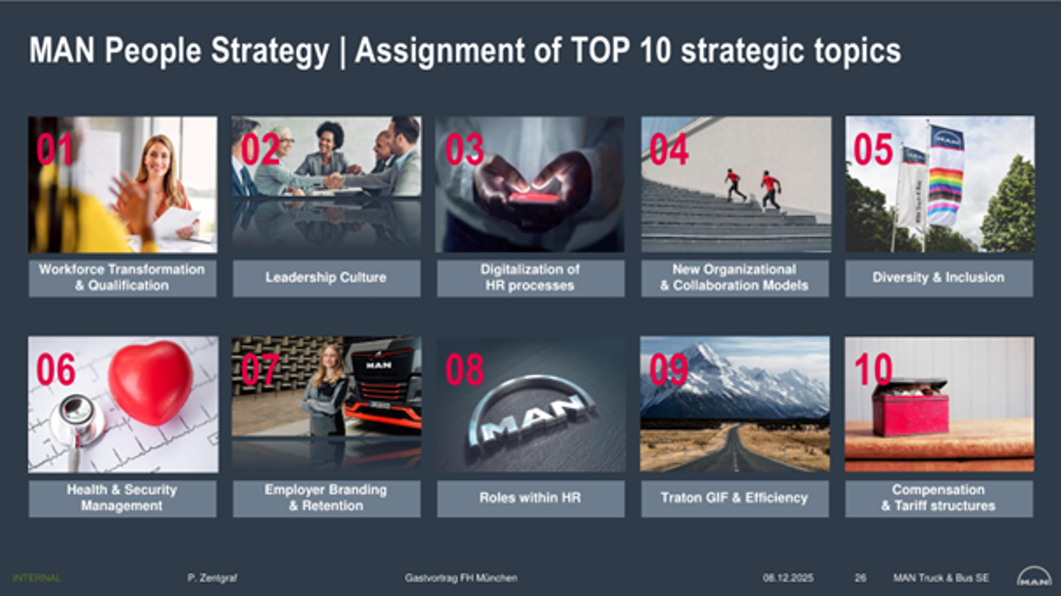 Philipp Zentgraf (Foto), seit 2023 Head of HR Strategy & Innovation bei der MAN Truck & Bus SE in München, hat einen Bachelor-Abschluss von der Universität Siegen sowie einen Master in Finance & Accounting von der Westfälischen Wilhelms-Universität in Münster. Der „Finanzer im Personalbereich“ referierte unter dem Titel „Aktuelle Themen im HRM und HR-Trends @ MAN – Wie sich eines der ältesten Industrieunternehmen Deutschlands in der Transformation neu erfindet“.